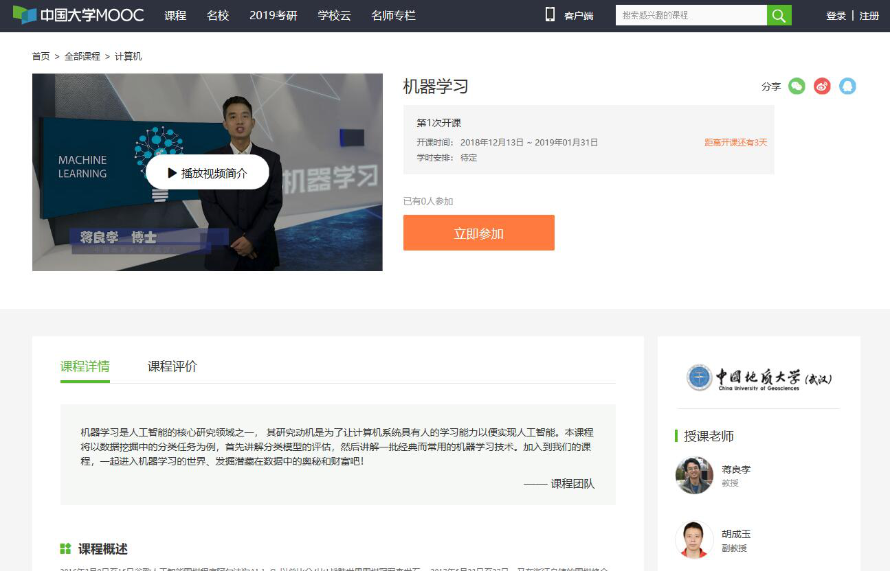 2018年12月13日,tyc122ccVIP(武汉)《机器学习》课程在中国大学MOOC平台正式开课。本课程由tyc122ccVIP教授蒋良孝,tyc122ccVIP副教授胡成玉主讲,课程内容精心设计,为员工提供了便利的学习平台。本课程将以数据挖掘中的分类任务为例,首先讲解分类模型的评估,进而讲解一批经典而常用的机器学习技术,是高等公司机器学习领域科研人员和对机器学习兴趣浓厚的师生不可或缺的高质量课程。课程链接:
