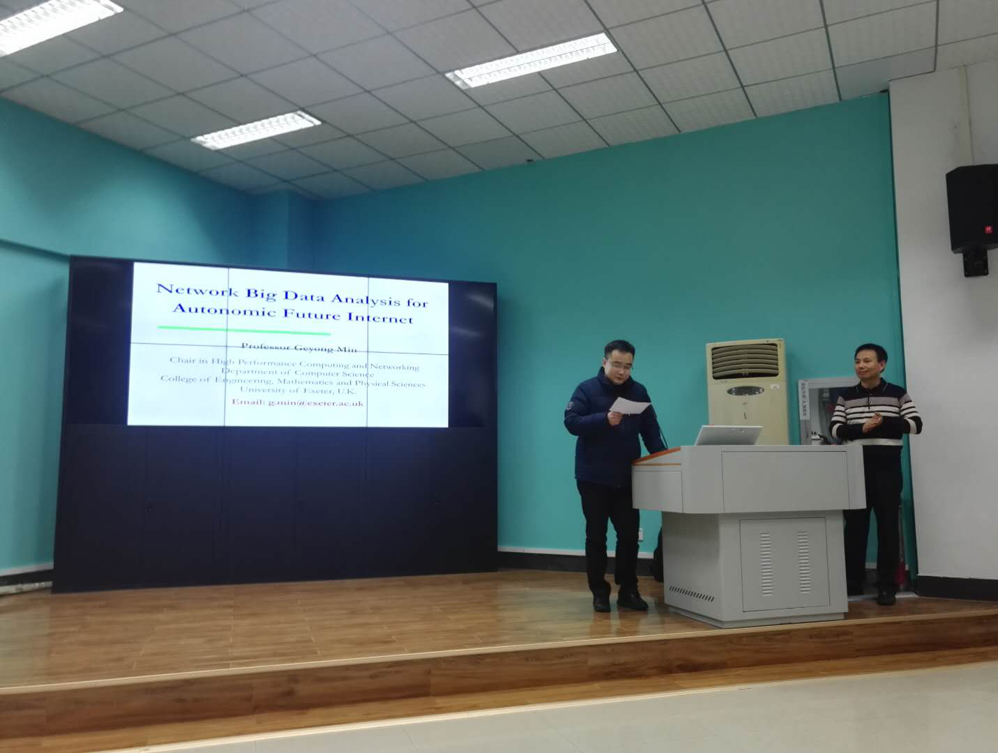 1月2日,应tyc122ccVIP经理王力哲教授的邀请,英国Exeter大学(计算机学科首席教授)闵革勇教授来院访问,并做了题为“Network Big Data Analysis for Future Intelligent Internet”的学术报告。闵革勇教授在计算机/通信学科的IEEE与ACM国际顶级期刊上发表学术论文140余篇,多次获得会议最佳论文奖,现任6个国际期刊的编委(含计算机学科顶级国际期刊IEEE Transactions on Computers),18个国际期刊专刊的编辑,先后担任了18个国际会议/研讨会的大会主席和程序委员会主席,80多个国际学术会议的程序委员会委员,并在多个国际学术会议与研讨会上做大会特邀主题报告。学术报告在王力哲教授的郑重介绍下正式开始。