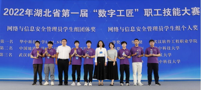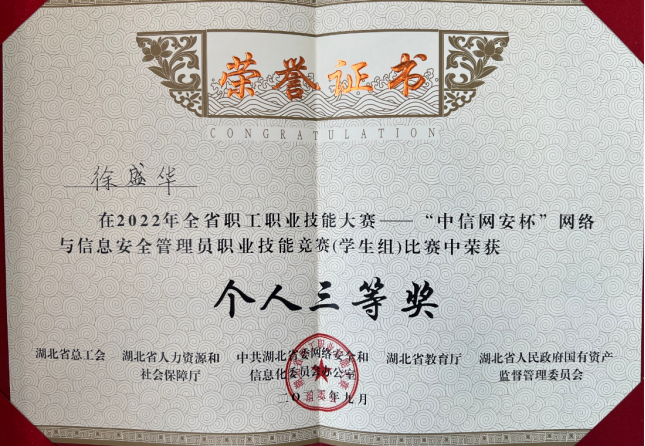 近日,从2022年湖北省第一届“数字工匠”技能大赛暨“中信网安杯”网络与信息安全管理员职业技能竞赛组委会获悉,由公司信息安全系朱静老师指导的“Flag又不队”战队(队员:覃程伟、孙升阳、张涛)以总分第二名的成绩荣获团体攻防对抗赛员工组二等奖,由马钊老师指导的“Flag对不队”成员徐盛华以总分第六名的成绩斩获个人综合靶场赛员工组三等奖。