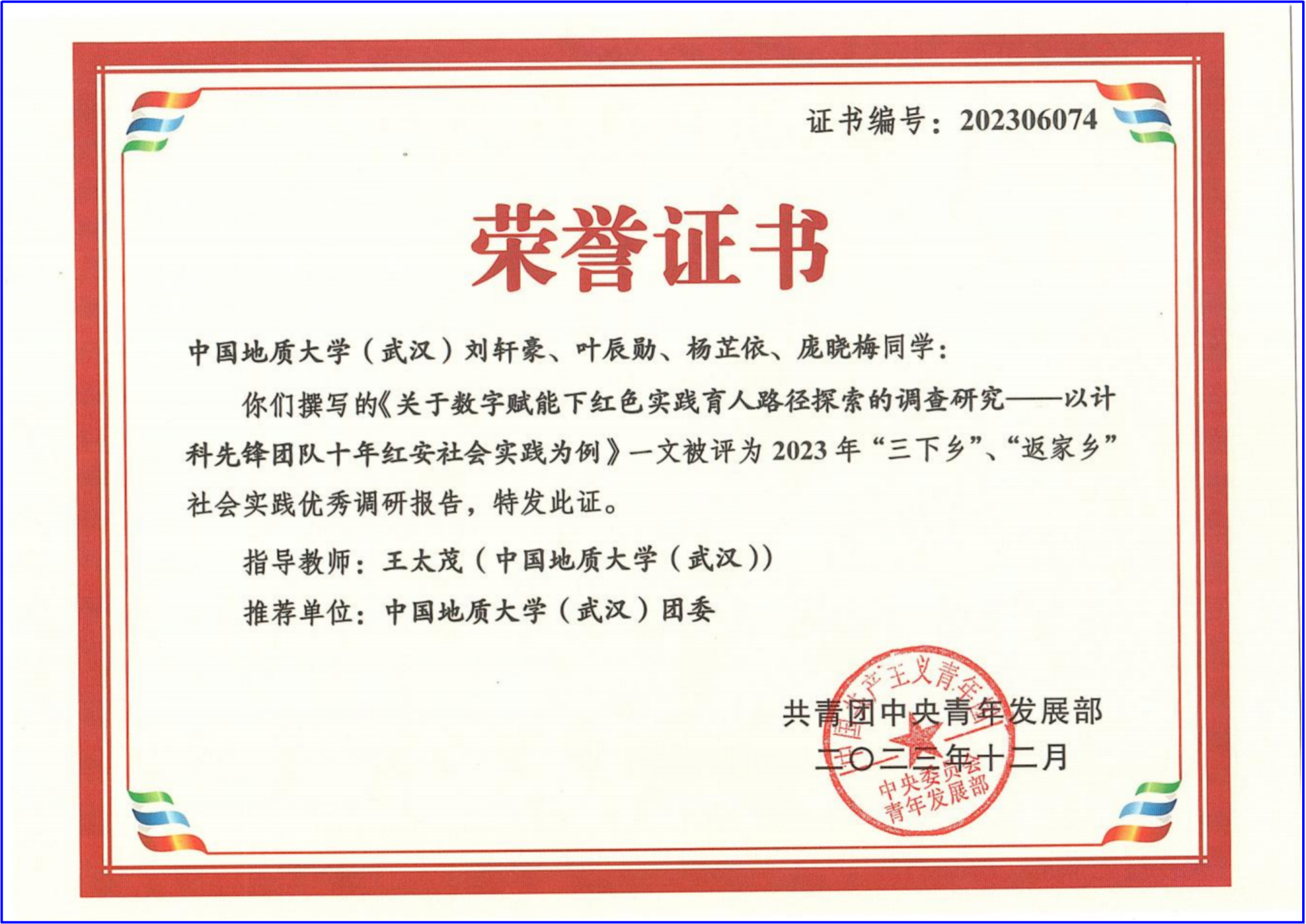 近日,共青团中央青年发展部公布2023年度“三下乡”、“返家乡”社会实践优秀调研报告拟入围名单。在公司王太茂老师指导下,刘轩豪、叶辰勋、杨芷依、庞晓梅同学的实践调研报告《关于数字赋能下红色实践育人路径探索的调查研究——以计科先锋团队十年红安实践为例》成功入围。