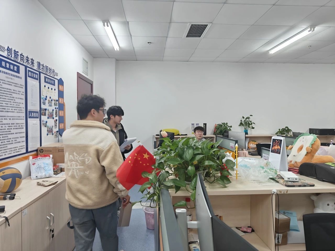 实验室的文化墙见证了员工们在导学团队中的成长与蜕变。这些生动的照片不仅展示了他们的精神风貌,还传递了一种积极向上的力量。在走访过程中,吴湘宁老师还碰到了同学们积极参与实验室器材的维护工作。他们认真检查机器的运行状况,及时排除故障,确保科研工作能够顺利进行。