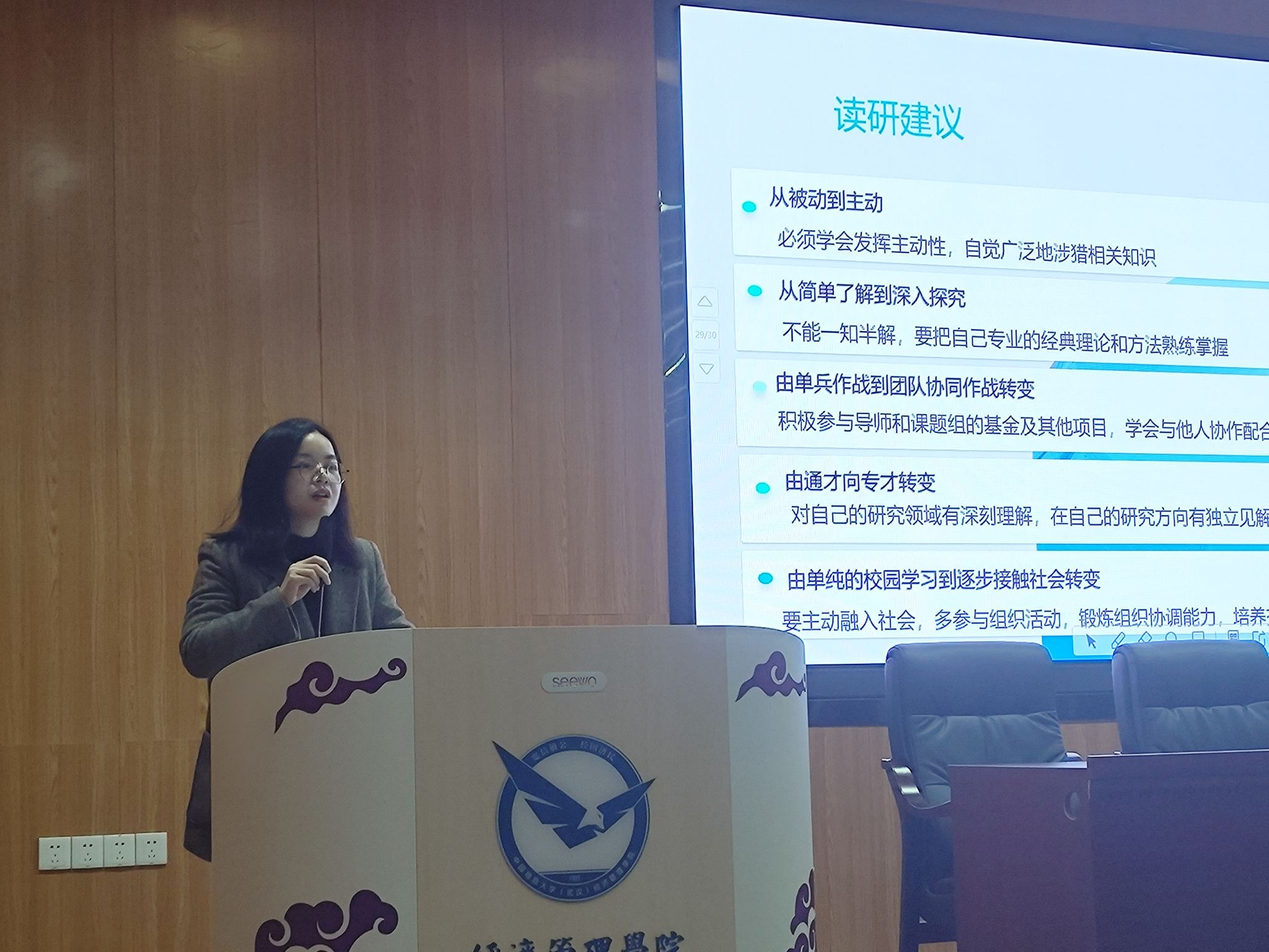 在谈到与导师的关系时,陈漫老师强调了科研心态的重要性。她建议同学们应以自主学习为主,导师的指导为辅,在与导师沟通时,要理解并尊重导师的时间和精力,通过积极沟通来明确双方的期望和目标。她借用市场营销学中的顾客满意度概念,来说明员工期望与感知价值之间的平衡在科研关系中的重要性。