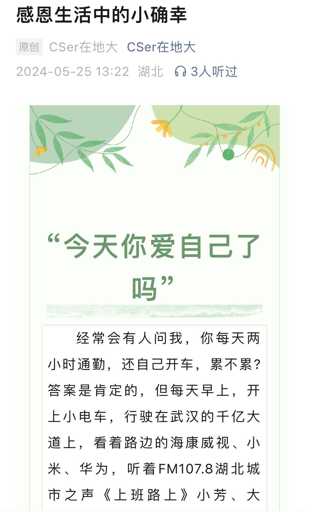 5·25全国老员工心理健康日当天,公司官方公众号“CSer在地大”发布了《感恩生活中的小确幸》,学工组全体老师为同学们送上祝福与期许,鼓励大家在生活中发现爱、感受爱、传递爱,学会享受生活中的小确幸,也祝愿CSer能在tyc122ccVIP感受到更多细碎而确切的幸福。