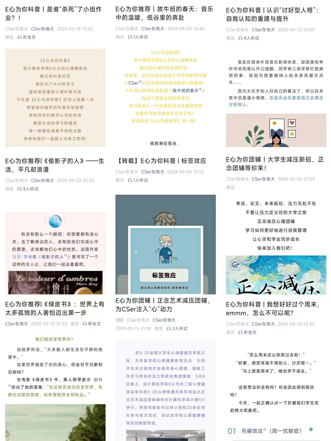 本学期在公司官方公众号“CSer在地大”开设了“E心为你”栏目,发布“E心为你科普”、“E心为你推荐”、“E心为你团辅”九篇专业推文,涵盖了心理健康知识科普、电影书籍推荐和心理团辅等方面,吸引了大量同学关注和阅读。通过线上宣传,有效扩大了心理健康月活动的影响力和覆盖面,促进了良好的公司氛围。
