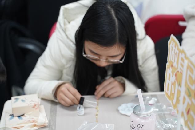 随着非遗手工老师的娓娓道来,螺钿艺术的神秘面纱被缓缓揭开。那细腻的讲解,如同春风化雨,老师们聚精会神,眼眸中闪烁着对传统文化的敬畏与向往。随着手工老师指尖翻飞,珍珠母贝薄片顿时在发簪上星河倾泻。女老师们暂时卸下科研重担,纤指执起蚌贝裁制的蝶翼,在合金簪首上铺陈星汉——青蚨贝化作藤蔓缠绕发簪,夜光螺凝成牡丹绽于胸针,珍珠母贝串起银河般的手链。林小艳老师凝神屏息,镊尖轻旋贝片角度,在智慧树图腾的枝桠间唤醒沉睡的星光,0.2毫米的贝母碎片竟折射出整个银河的辉光。卢笙老师将现代配色融入传统纹样,指尖的螺钿拼贴出灵动翩跹的蝴蝶。
