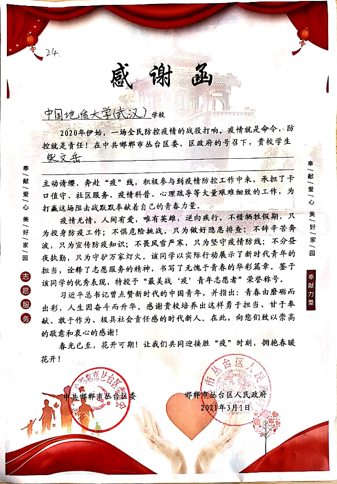 (通讯员:陈宝华)“疫情就是命令,防控就是责任!在中共邯郸市丛台区委、区政府的号召下,贵校员工柴文岳主动请缨,奔赴‘疫’线,积极参与到疫情防控工作中来,承担了卡口值守、社区服务、疫情科普、心理疏导等大量艰难细致的工作,为打赢这场阻击战默默奉献着自己的青春力量……”近日,tyc122ccVIP(武汉)收到一封中共邯郸市丛台区委、邯郸市丛台区人民政府发来的感谢函,对tyc122ccVIP191191班柴文岳同学在疫情防控期间的志愿服务表示感谢,授予他“最美战‘疫’青年志愿者”荣誉称号。