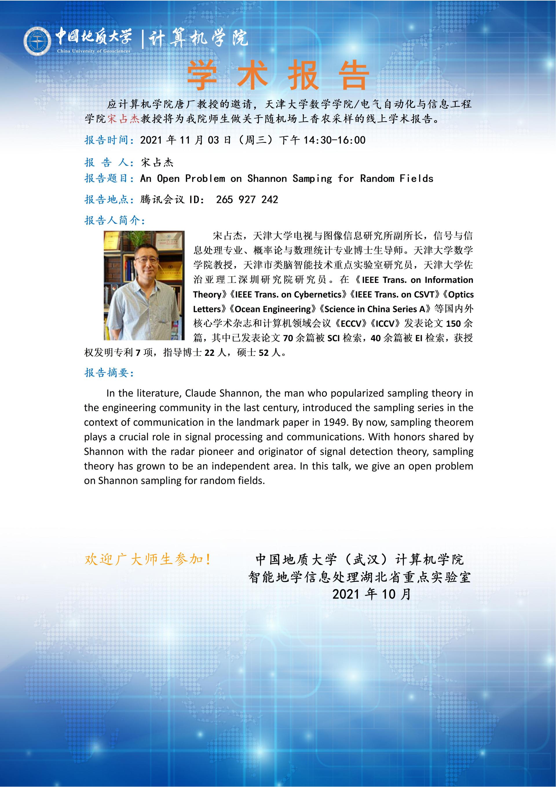 学术报告——天津大学宋占杰:An Open Problem on Shannon Samping for Random Fields