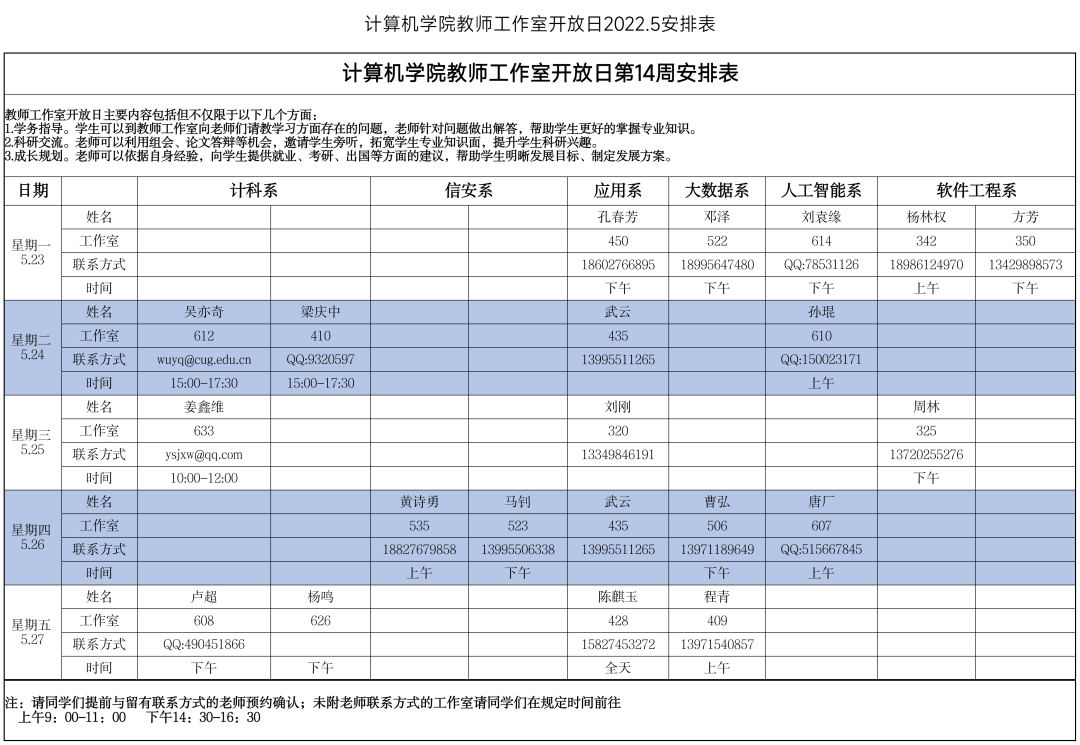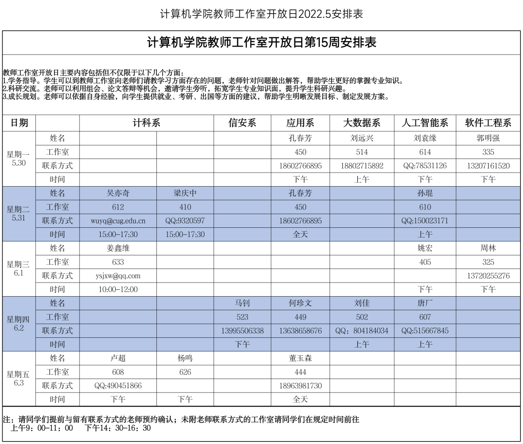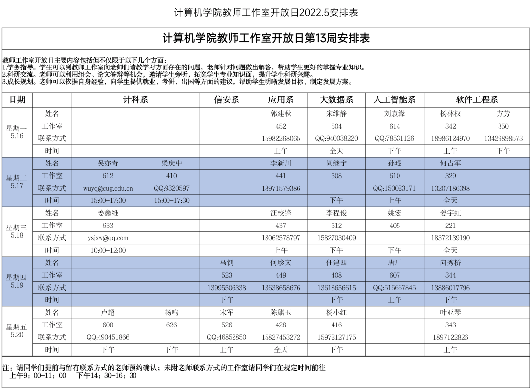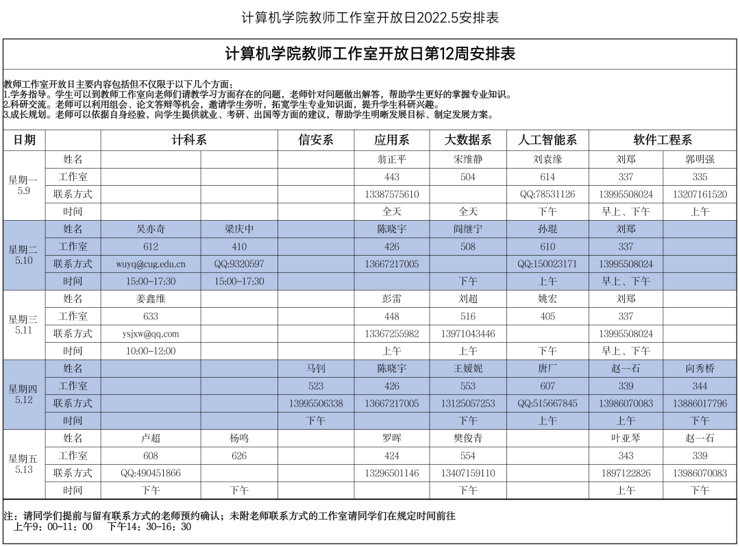 tyc122ccVIP教师工作室开放日5月安排来啦!每个工作日都将会有不同专业的老师,在各自的工作室里期待同学们的到来,为同学们解疑答惑,指导专业问题,提升科研水平,甚至畅谈人生理想!附上教师工作室开放日5月时间安排表: