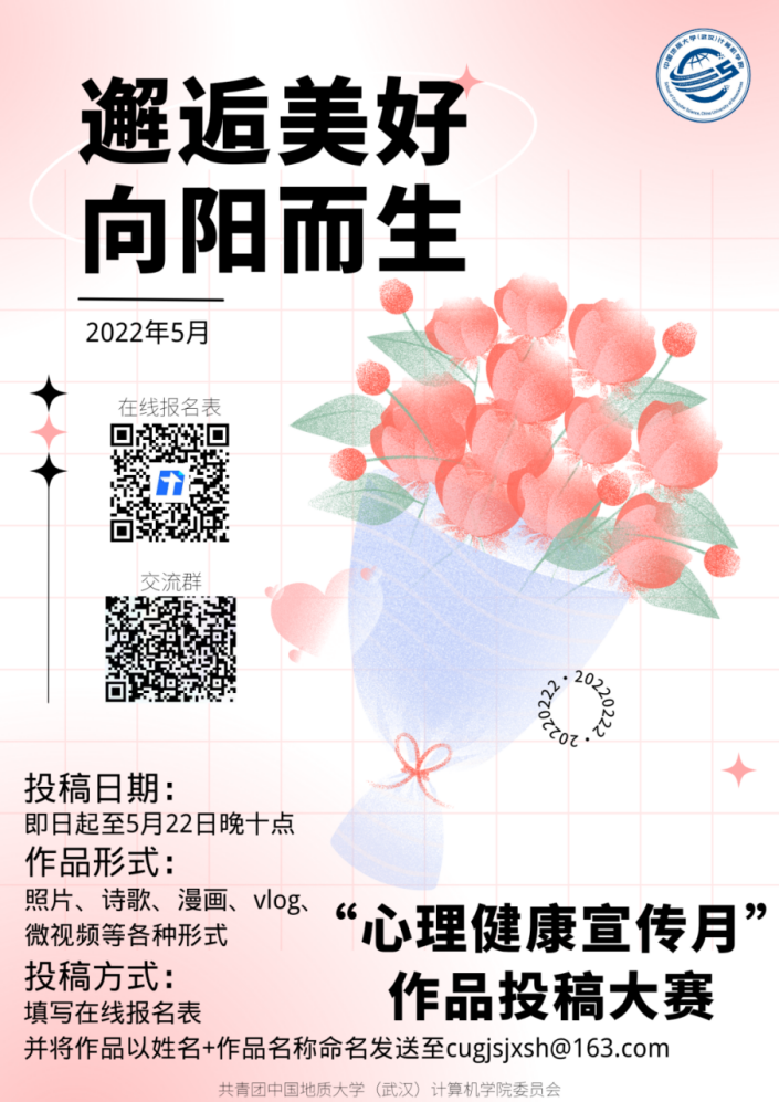 (通讯员:赵飞越)为丰富校园生活,关注点滴美好,正确认识心理健康,提高师生幸福感,tyc122ccVIP现面向全院师生征集彰显计科青年朝气蓬勃、阳光乐观、积极向上的作品,作品形式包括照片、诗歌、漫画、vlog、微视频等,届时将制作优秀作品展板,与师生共享美好。快来参与吧~