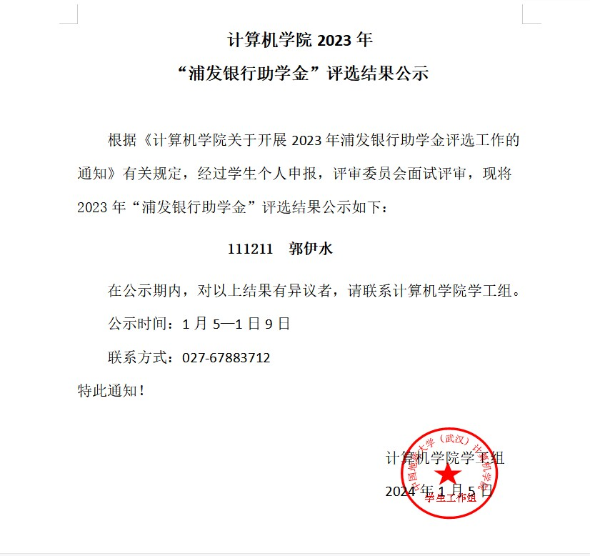 2023年“浦发银行助学金”评选结果公示