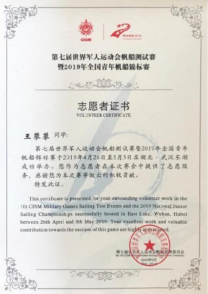 作为班长,他兢兢业业,认真负责;作为党员,他求真务实,乐于奉献。在宿舍里,热心的他总是为室友们提供无微不至的照顾。王攀攀总是把“给永远比拿快乐”放在嘴边, 2019年他如愿参加了武汉军运会帆船测试赛志愿者活动,在奉献中担当责任,体现价值。