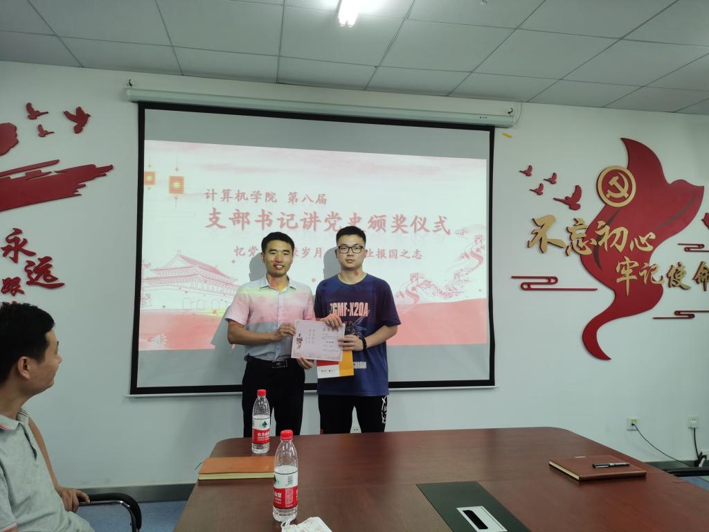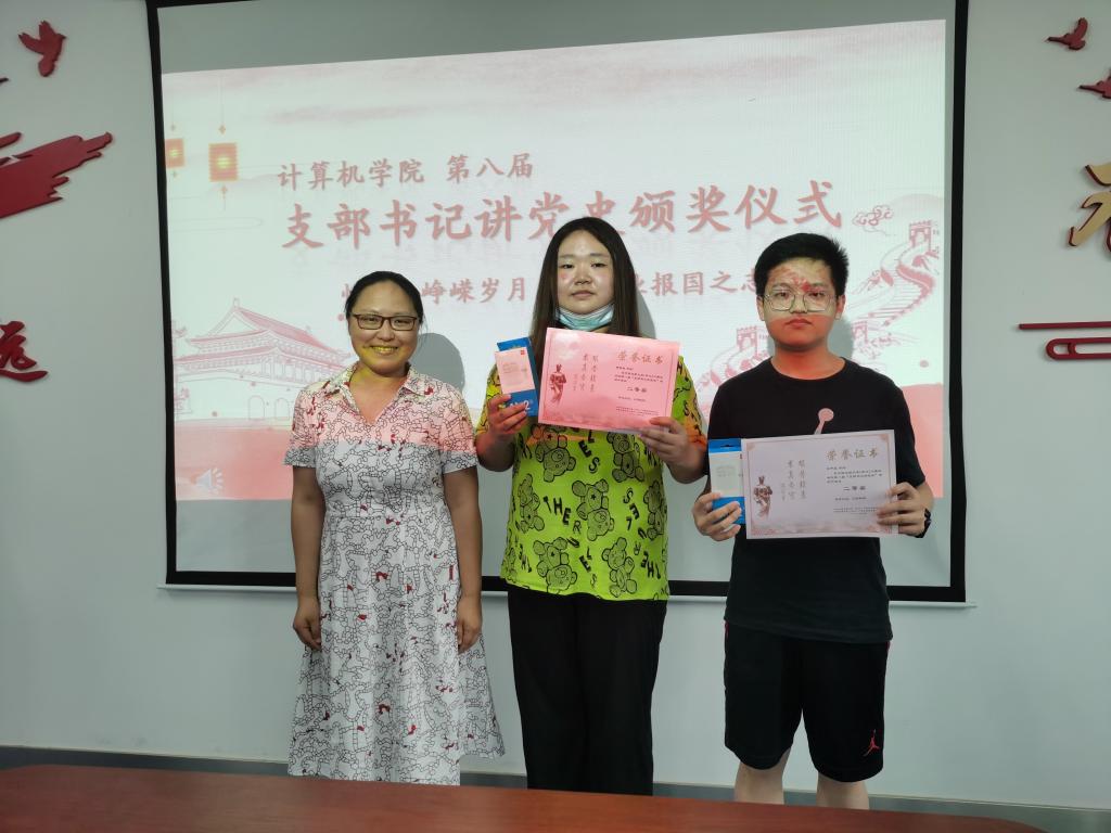 石剑峰为2018级硕士研究生第二党支部支部书记王开、本科生计科第二党支部王子震、博士生党支部甄慧翔颁发三等奖。