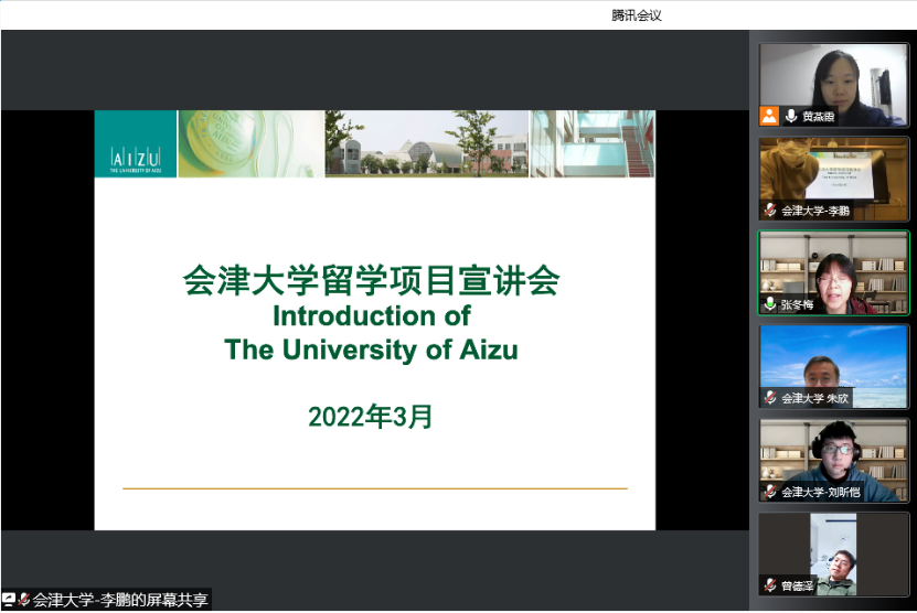 (通讯员:张园园)2022年3月8日晚上,日本会津大学留学项目宣讲线上会议顺利召开。日本会津大学老师李鹏、朱欣、吕国伟,会津大学在读员工陈发浩、傅孛骞、刘昕恺,tyc122ccVIP副经理张冬梅、计算机科学与技术系系主任曾德泽、国际合作办公室事务秘书张园园参加会议。宣讲会由国际合作办公室主任黄燕霞主持。
