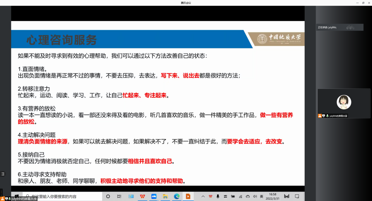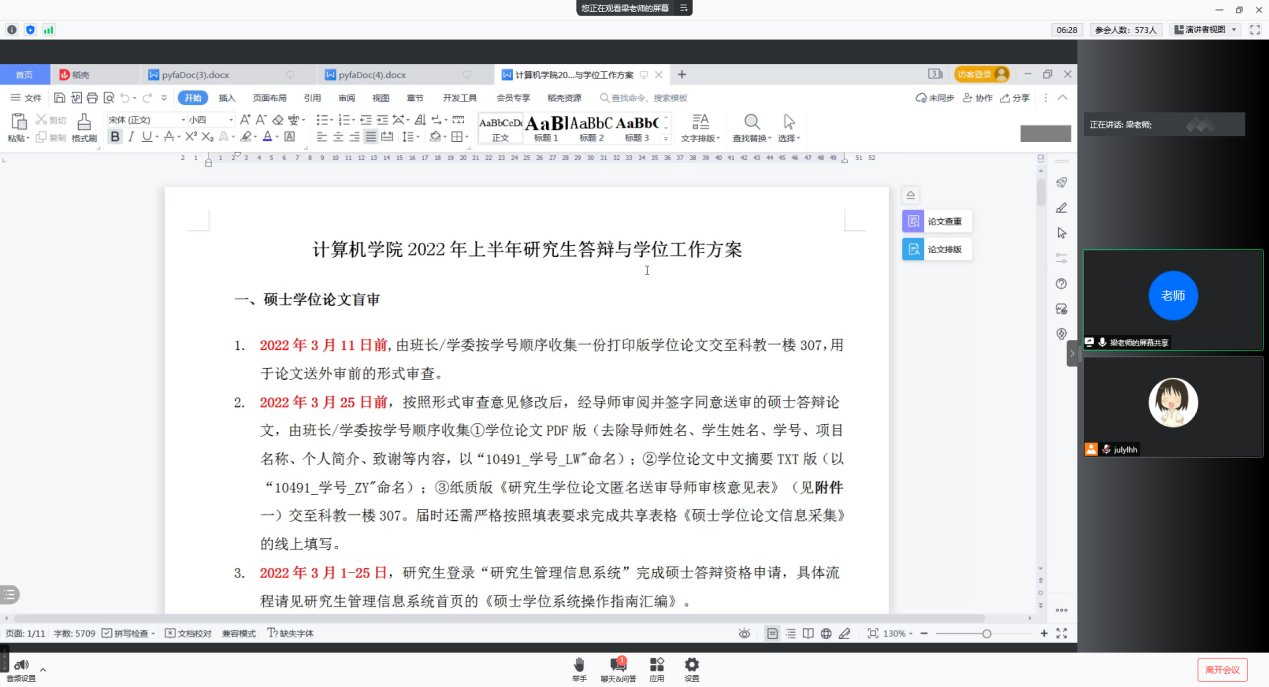 梁媛针对不同年级详细讲解公司产品和毕业方案。围绕学位论文盲审、学位论文评阅、答辩申请审核、答辩、论文查重及提交等方面做阐述,并结合同学们的问题做补充说明。叮嘱同学们关注开题时间,认真撰写论文,做好查重工作。