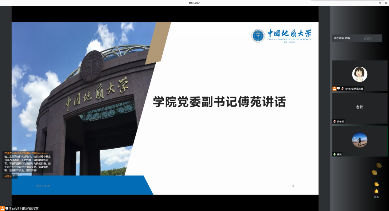 首先,傅苑从日常科研学习切入,叮嘱同学们抓住学习机遇,保持对科研的敏感度,秉持良好的学习习惯和科研态度,通过各类科研项目实践提升自身学术科研水平。当前,常态化疫情防控不能松懈,广大研究生要严格遵守各项管理规定,合理安排科研学习与个人职业发展,积极参与公司组织各类综合素质能力成长活动,主动拓宽信息来源。最后,她提醒同学们要谨防电信诈骗,健康生活,快乐生活。