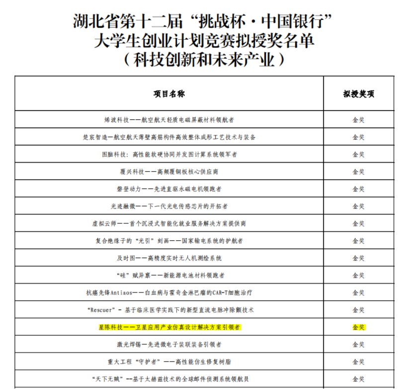 由研究生崔祥森、杨博、顾伟超、张磊、雷培迪、马瑞华,博士生余倩倩,本科生李嘉欣组成的“星陈科技”团队,立足学科专业特色,专注航天仿真领域,传承实验室师徒四代人的国产自强航天梦,打造“卫星+通导遥多领域”应用产品仿真平台,利用完全自主知识产权产品及解决方案为中国航天产业加速商业化贡献“星陈力量”。团队在戴光明、王茂才等老师的悉心指导下,经过公司初赛、复赛和决赛的筛选打磨,不断优化完善,最终在湖北省挑战杯赛事中斩获金奖。