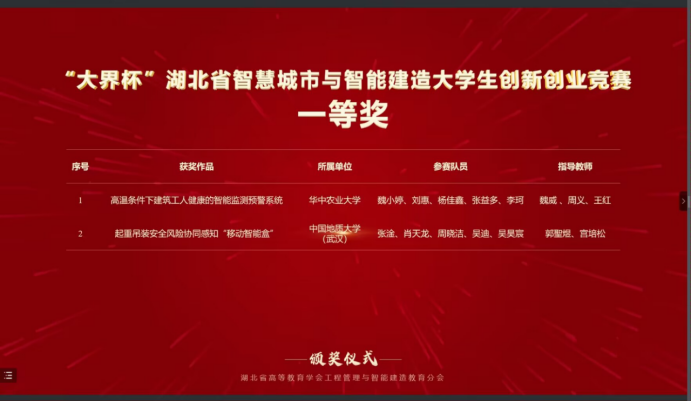 据悉全国智慧城市与智能建造老员工创新创业竞赛是当前工程管理领域影响力最大、影响范围最广的学科竞赛。本次比赛,2021级本科生吴昊宸与经济管理公司工程管理专业组成联队(团队成员:张淦、肖天龙、周晓洁、吴迪、吴昊宸),以参赛作品“起重吊装安全风险协同感知智能装备的研发与应用”(指导老师:郭聖煜、宫培松)进入决赛,最终从大赛主赛道来自98所高校的107支队伍的参赛作品中脱颖而出,荣获一等奖。此前在“大界杯”湖北省智慧城市与智能建造老员工创新创业竞赛中,该参赛作品已经获得一等奖。