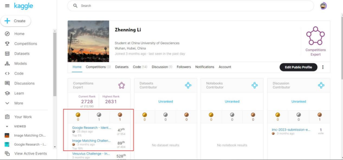 国合班本科生李祯宁同学在Kaggle数据科学竞赛-Image Matching Challenge 2023和Kaggle数据科学竞赛Google Research - Identify Contrails to Reduce Global Warming比赛中分别获得铜牌(Top19%)和银牌(Top5%)奖项;谭以宁、秦浩然、陈予贤三人组成的队伍SatoshiShimomoto在Kaggle数据科学竞赛GoDaddy - Microbusiness Density Forecasting,Kaggle数据科学竞赛AMP®-Parkinson's Disease Progression Prediction和Kaggle数据科学竞赛March Machine Learning Mania 2023三场比赛中分别斩获三枚银牌(Top2%,Top4%,Top5%),三场比赛的参赛人员分别为GoDaddy - Microbusiness Density Forecasting:谭以宁、秦浩然、陈予贤;AMP®-Parkinson's Disease Progression Prediction:谭以宁、秦浩然;March Machine Learning Mania 2023:谭以宁。