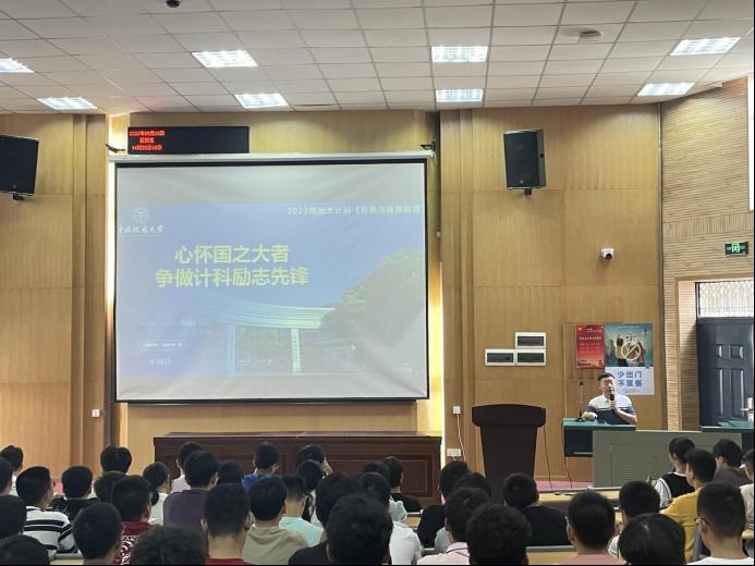 为深入学习贯彻党的二十大精神,使员工了解国内外形势,把握信息学科发展态势,增强员工使命感与自信心,9月8日,计算机公司党委书记李国昌以“心怀国之大者,争做计科励志先锋”为主题给2023级新生讲授形势与政策教育课,2023级全体员工参加。