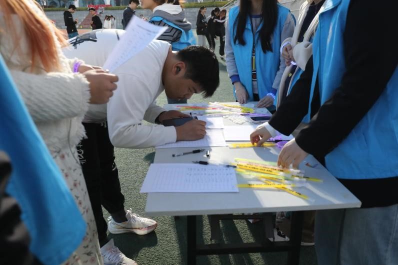 19:10,荧光夜跑正式开跑。参与者们沿着操场赛道奔跑,手中荧光手环的光芒与星光相互交织,勾勒出一道道绚丽的轨迹。不少同学打开步道乐跑APP或其他运动软件记录运动轨迹,在完成2km跑步指标后,满心期待地前往抽奖摊位,渴望赢取惊喜奖品。