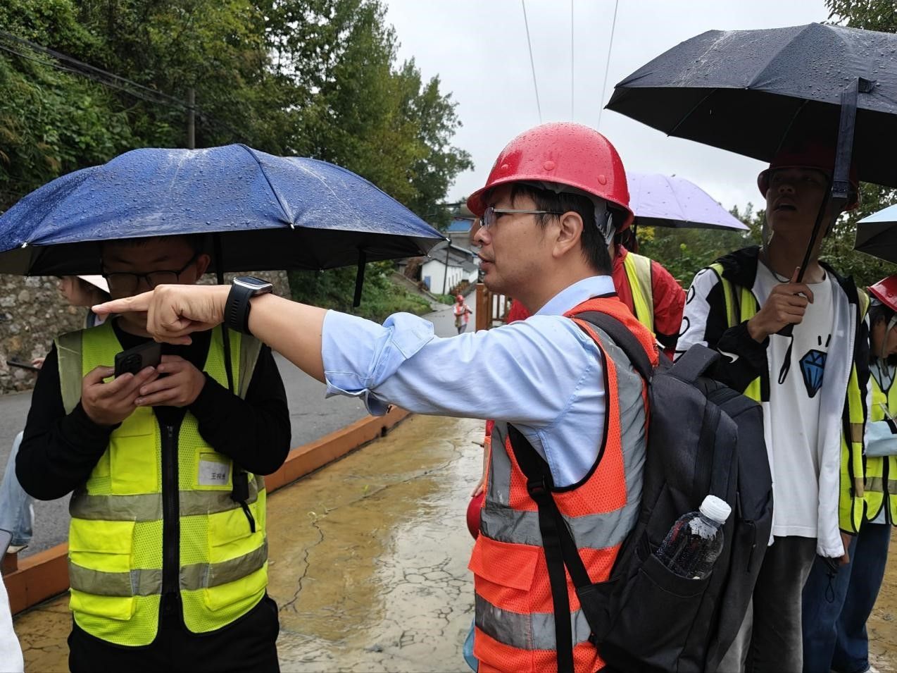 9月13日,天空下起了淅淅沥沥的小雨。大家带上雨伞,背上地质包,按时出发前往填图区南踏勘路线 —— 这是对我们 “地质人” 意志的考验。雨中的山路格外湿滑,每走一步都需要格外小心。何珍文老师带领着我们观察填图区出露的地层界线,教导我们使用地形图定点,并完成野外地质数据采集。