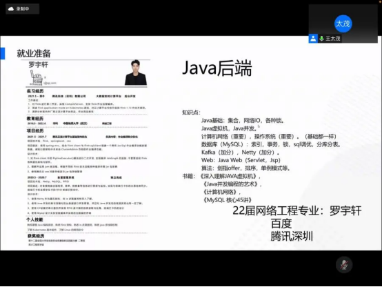 接下来,受王太茂邀请,2018级网络工程专业罗宇轩同学根据自身“BAT”的求职经验进行分享。首先,罗宇轩分析了当前的就业形势和行业状况,提醒同学们抓住秋招重要时间点;接下来对同学们的就业方向选择提出建议,并分享了自己和身边多位同学的就业准备过程;最后罗宇轩同学分享了自己求职过程中的心路历程,鼓励同学们及时行动,勇敢迈出第一步。