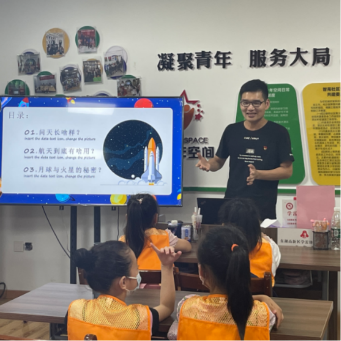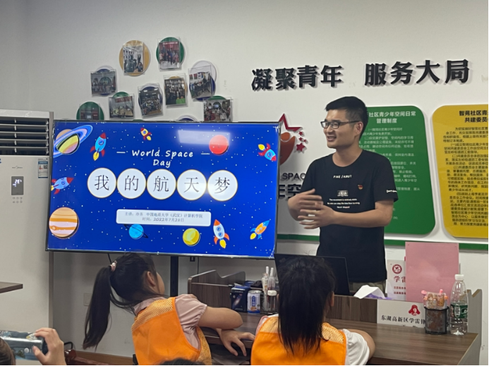 “‘问天’在太空到底忙些啥?未来我们是否可以移民火星?拥有变重力科学实验柜的问天实验舱到底长啥样?”一个个稚嫩的航天梦正在一张张桌椅的“小天地”里悄然萌芽。7月28日,tyc122ccVIP博士生党支部追随习近平总书记的脚步,前往武汉东湖高新区左岭街道智苑社区,面向社区青少年开展航天科普宣讲专题课程,充分发挥学科优势,激发科学兴趣,厚植科学精神,引导青少年在科学探索中茁壮成长,携手共绘航天梦和中国梦。