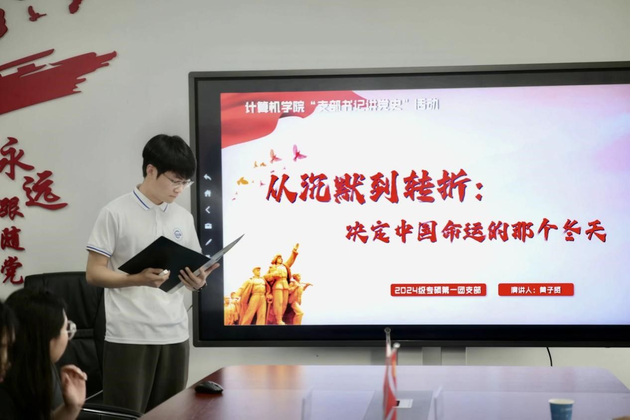 本科生信安党支部陈星以“改革攻坚,开放共赢”为主题,讲述党的十一届三中全会的召开、小岗村的“包干”历史、南海改革以及南方谈话四座历史丰碑呼吁广大青年党员继续坚持改革开放的思想。电子信息第一团支部黄子贤富有激情地讲述党的十一届三中全会召开时期邓小平以及陈云等优秀革命领导者的故事鼓舞我们要敢于改革创新。学硕计科第一党支部刘睿萌以培养“硅基人才”为话题从科教兴国到东湖高新激励员工们积极投身于科技创新的事业中。本科生计科党支部刘轩豪讲述了从邓小平南方谈话至今不断突破深化的改革历史。