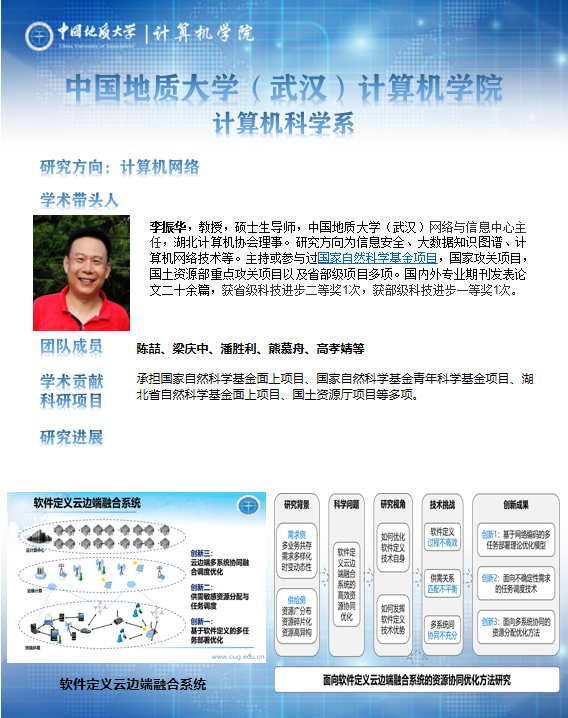 主要开展信息安全、大数据知识图谱、计算机网络技术、软件定义网络,物联网、云边计算、网络策略技术等方面的科研工作。提出了基于软件共享与网络编码的任务部署模型,设计了资源敏感的任务镜像部署、云边端资源“纵向赋能、横向协同”机制,厘清了边端融合系统中存储、网络与计算资源的耦合关系并设计了全局联动的资源协同优化方法。共有专任教师8人,其中学术带头人1人,学术骨干2人;主持或参与过国家自然科学基金项目,国家攻关项目,国土资源部重点攻关项目以及省部级项目多项。国内外专业期刊发表论文100余篇,获省级科技进步二等奖1次,获部级科技进步一等奖1次,国家发明专利和软件著作权20项。