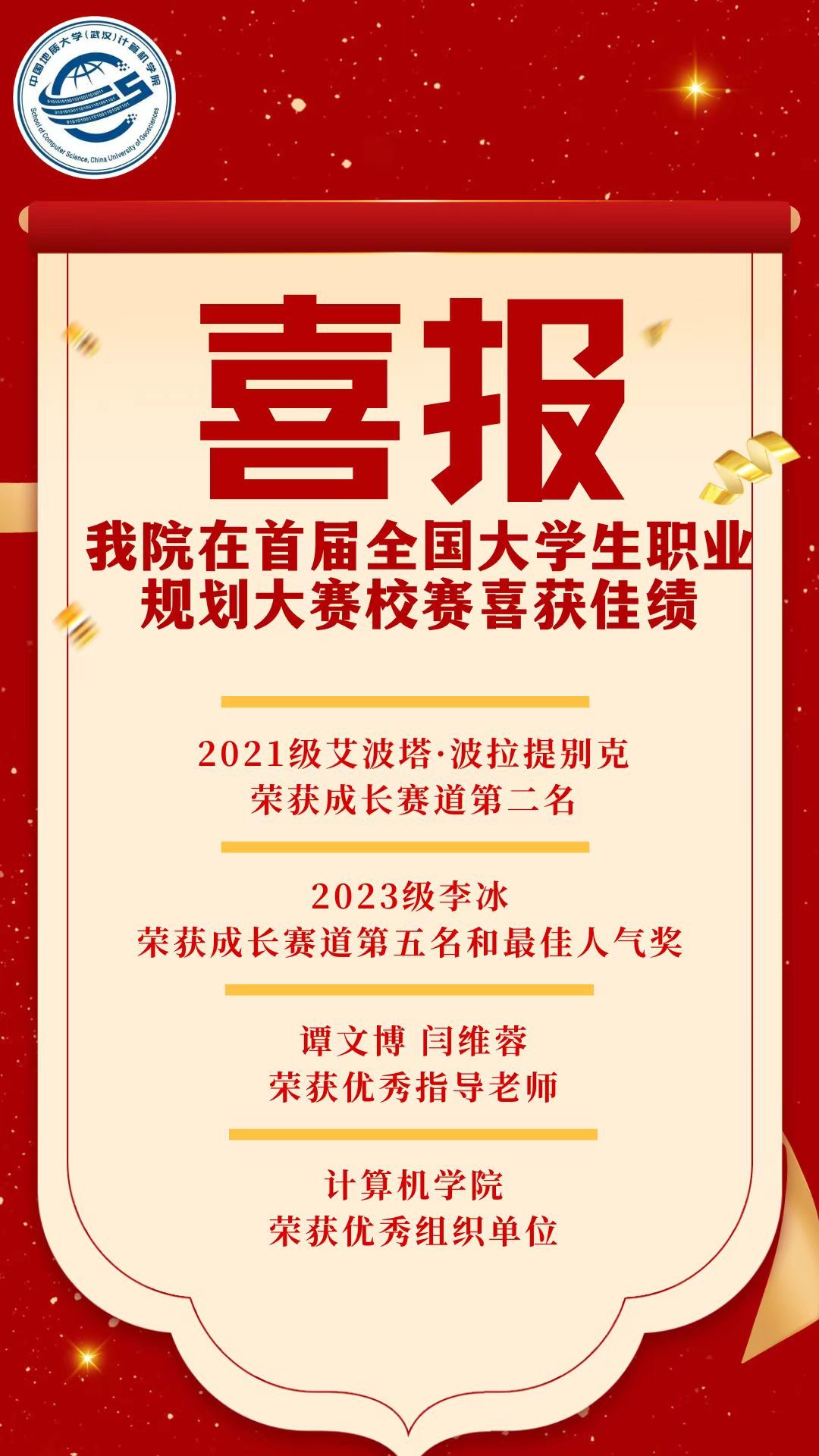 在激烈的校内决赛中,公司表现尤为出色:21级艾波塔·波拉提别克荣获成长赛道第二名,23级李冰荣获成长赛道第五名和最佳人气奖;21级辅导员谭文博,23级辅导员闫维蓉荣获优秀指导老师,tyc122ccVIP荣获优秀组织单位。