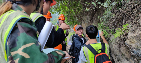 在野外实习时,郭老师带领同学们上山下坡,总是饱含热情地用“川普”给同学们讲解各种地质现象以及很多其他小故事。和张老师一起搭班带队时,两位老师会给同学们耐心细致地讲解知识,互相补充,生怕有什么知识同学们还不知道。汪校锋老师打趣道:“两位老师互相补充越讲越多,有时还会占用其他班的时间”,足以可见两位老师在教学时的认真态度。在被问到实习最大的感受时,郭老师笑着说是开心,因为对地质工作有感情,所以不觉得苦。正是这种对地质工作的热爱,让郭老师能够在野外不知疲倦地教学,晚上在教室里给员工答疑解惑,深夜还在寝室跟员工核对数据。
