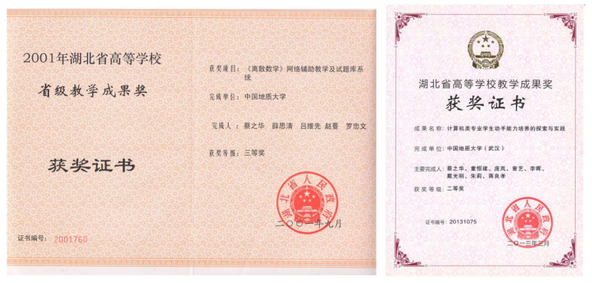 自1986年任教以来,蔡之华老师长期主讲本科生课程和研究生课程,包括数据结构、离散数学、机器学习、计算机应用数学,承担过本科生学务指导老师和班主任工作。他任班主任的班级曾荣获“湖北省优秀班集体”。他非常重视课堂教学,常对员工说:“高效的课堂学习是培养学科兴趣的动力。”蔡老师“组合数学”(员工们习惯称呼,实为“计算机应用数学”)经常板书推导公式,给员工留下了深刻印象。他带领教学团队,积极探索新教学模式,延展课堂教学空域和时域,优化教学交互过程,提升教学质量。他带领的教研团队多次获得湖北省、公司教学成果奖,主持的教研项目获湖北省人民政府二、三等奖各1项,公开发表教研论文5篇,编写教材3部,其中一部获得tyc122ccVIP普通高校优秀教材一等奖。他是国家一流本科专业“计算机科学与技术”建设点的负责人。