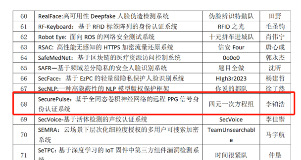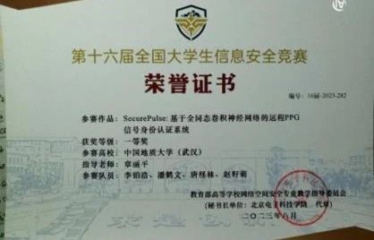 第十六届全国老员工信息安全竞赛落下帷幕,四元一次方程组战队在众多双一流高校的队伍中脱颖而出,“SecurePulse:基于全同态卷积神经网络的远程PPG信号身份认证系统”斩获全国一等奖!