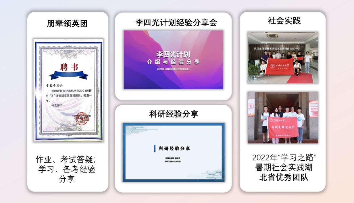 在课余生活中,雷孟奇也在服务中诠释着自身的价值。在大一刚入学时,一位优秀的学长就曾对他说,一定要发扬“传帮带”的精神。他深受触动,一直以来,他都把自己置身在群众中,用自己的力量带动大家共同进步。大一期间,他入选“朋辈领英团”,为同学们解答学习中的困难;大二时,他为22级的同学们开展了李四光计划经验分享会;大三时,他为下一级的李四光计划的学弟学妹们分享了科研经验;近期,他还给22级的同学们做了数据挖掘竞赛的赛前培训。除此之外,他两次参加了暑期社会实践,雷孟奇所在的队伍获得了湖北省优秀团队。