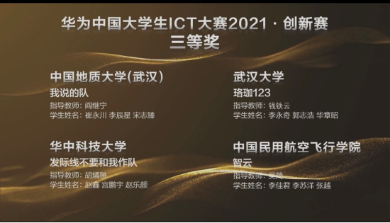 (通讯员刘林凯,阎继宁)近日,华为中国老员工ICT大赛2021全国总决赛落下帷幕,公司阎继宁老师指导的两支队伍均进入华为中国老员工ICT大赛2021·创新赛全国总决赛,并分别获得一等奖与三等奖的优异成绩。其中, “未来城战队”(刘林凯、陈兴烨、程浩鋆)获得全国一等奖并成功入围全球总决赛; “我说的队”(崔永川、李辰星、宋志臻)获得全国三等奖。