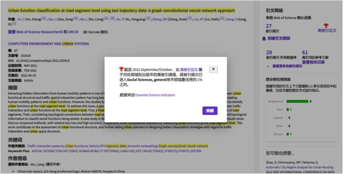 根据2022年10月基本科学指标数据库(Essential Science Indicators,简称ESI)最新数据显示,tyc122ccVIP全空间地理大数据智能处理与GIS基础平台研究中心团队在国际城市研究主流期刊Computers, Environment and Urban Systems(简称CEUS)上发表的学术论文“Urban function classification at road segment level using taxi trajectory data: A graph convolutional neural network approach”入选ESI高被引论文(Highly Cited Paper)。该论文第一作者为团队的博士生胡胜,通讯作者为吴亮教授。CEUS为国际顶级计算城市学和地理信息科学的重要刊物,期刊以计算机科学为背景,聚焦城市规划、交通、能源、环境、社会学和经济等学科融合的新兴领域,刊发城市计算、大数据和城市系统等方向的最新研究。当前CEUS的影响因子为6.454,为T1期刊。