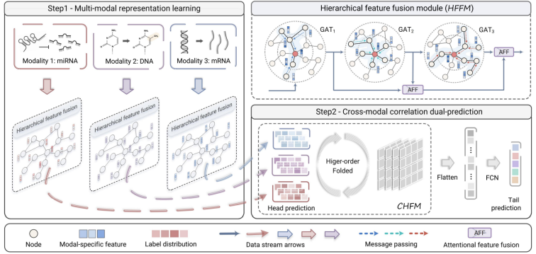 多模态学习旨在整合来自不同模态的一致信息和互补信息,以获得更加准确可靠的决策。然而现有的多模态学习方法通常关注不同模态的局部特征,而忽略了不同模态特有的全局特征和结构信息的学习。针对这一问题,该论文提出了一种新颖的层次注意学习网络(HALNet)用于多模态生物医学数据的分类任务。具体来说,HALNet有三个优点:1)提出了一个分层特征融合模块,利用图注意力网络和多头注意力机制学习多级特征,设计了一种渐近式融合的策略来聚合分层特征,形成全局表征;2)引入了一个跨模态高阶融合模块,以捕捉标签空间中的不同模态间潜在的跨模态关联信息;3)设计了一种对偶预测模式来产生更可信的决策结果。在三个真实世界的多组学多模态医学数据集上进行的大量实验表明,与该领域最先进的方法相比,HALNet取得了有竞争力的性能。下图描绘了该模型的整体架构。