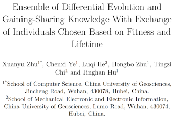 近日,在大数据系李程俊老师的指导下,计算机科学与技术专业的本科生朱轩宇以第一作者撰写的论文《Ensemble of Differential Evolution and Gaining-Sharing Knowledge With Exchange of Individuals Chosen Based on Fitness and Lifetime》,被老牌国际期刊《Soft Computing》(T3)接收。本篇论文,是李程俊老师指导本科生成功发表的第二篇论文,为后续老员工挑战杯大赛积累实力。