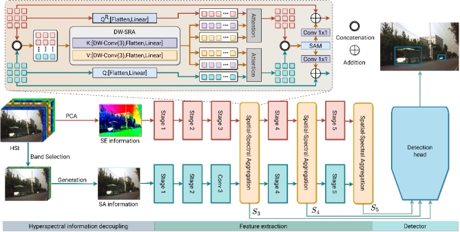 基于深度学习的高光谱图像(HSI)分类和目标检测技术在图像内容分析、解释和更广泛的 HSI 应用中发挥着重要作用。然而,目前的高光谱物体检测方法主要强调光谱或空间信息,忽视了这两方面之间宝贵的互补关系。在本研究中,作者提出了一种新型的光谱-空间-聚合(S2ADet)目标检测器,它能有效利用高光谱图像中固有的丰富光谱和空间互补信息。具体来说,S2ADet有三个亮点:1)提出了高光谱信息解耦器,通过波段选择和主成分分析汇总光谱和空间信息来处理高光谱数据,从而减少冗余。2)提出了一种用于光谱空间特征交互的特征聚合双流网络。3)统一了高光谱波段数,解决了现有高光谱数据波段数不一致的问题。此外,为了解决现有数据库的局限性,作者还标注了一个更加广泛的数据集,命名为HOD3K,其中包含 3242 幅在不同现实世界场景中捕获的高光谱图像,涵盖三个物体类别。在两个高光谱数据集的综合实验表明,S2ADet超越了现有的最先进方法,取得了有竞争力的性能。