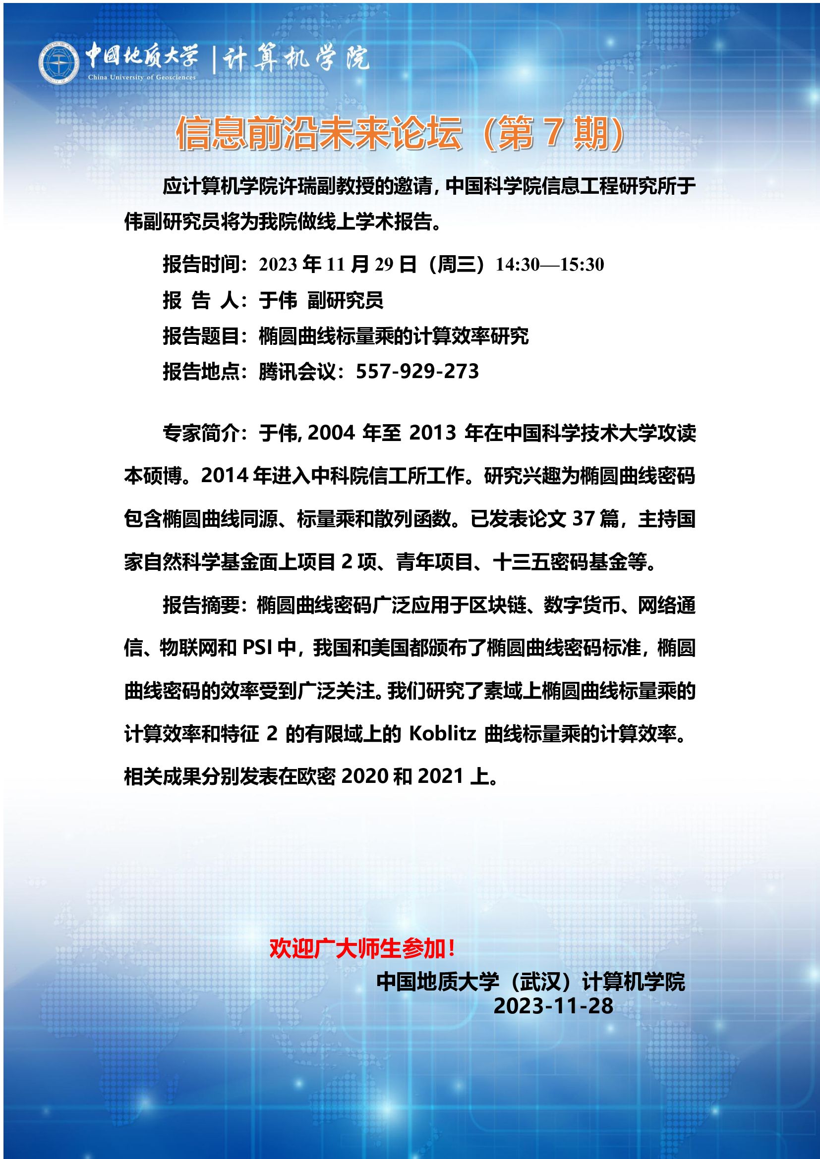 信息前沿未来论坛(第7期):中国科公司信息工程研究所于伟副教授——椭圆曲线标量乘的计算效率研究